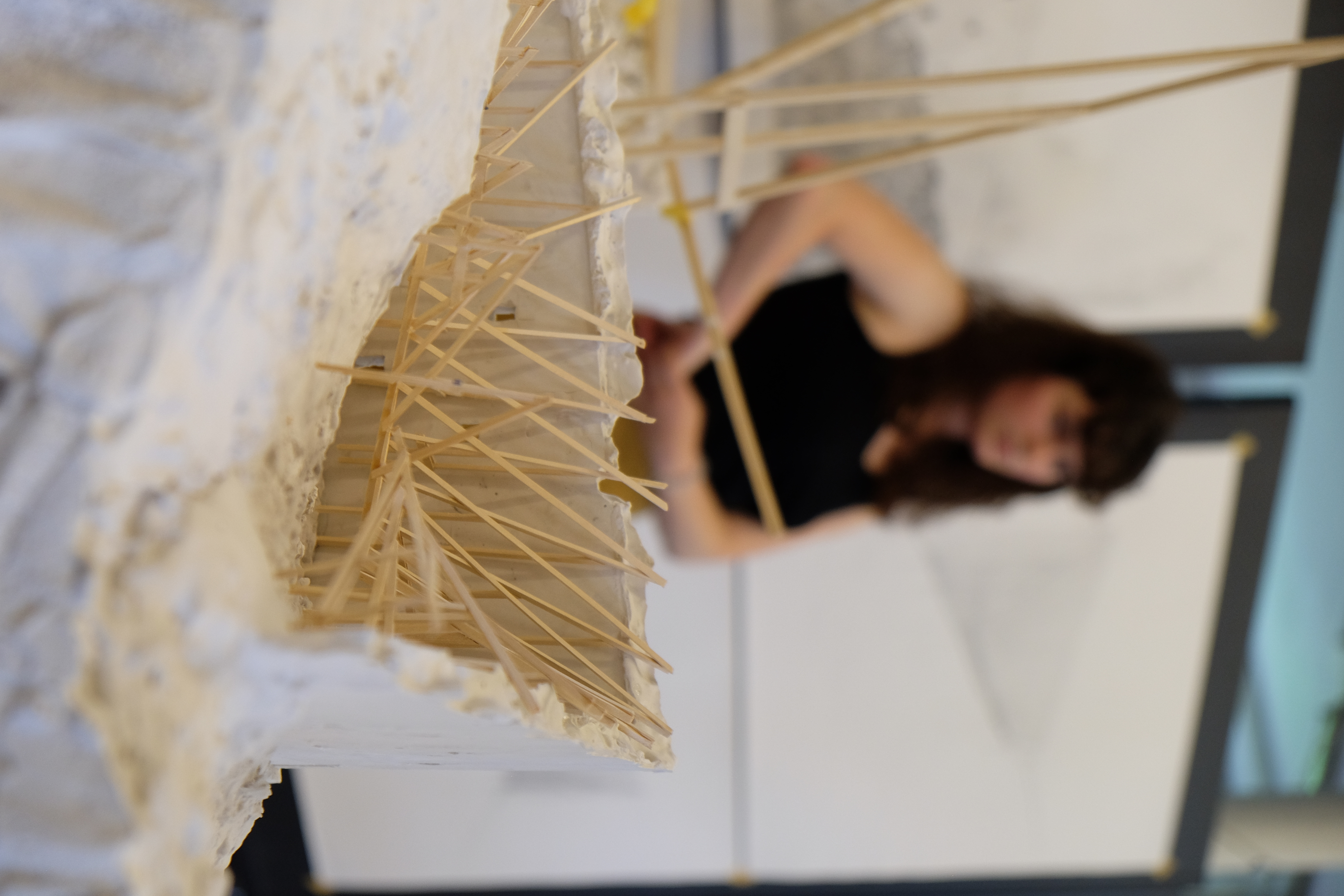 The object can be whatever– a shelter, a place for meditation, a church. Only man himself will bring the meaning, the function to it. A high stone wall towers over the Braunwald, emphasizing the silhouette of Orstock. The wall is made of local stone, which is then filled with concrete (to make a sharer shape as in contrast with the nature) and it’s created by local people, to sort of putting people together to create something that can become significant for Braunwald. The building marks the landscape – from outside and inside as well. When you enter the space, you can feel the difference between mankind and nature, a perfect smooth circle hovering above the steeply sloping rough rocky ground, a roof to hide under and the edge of the wall cutting through the air (as the edge of Ortstock) and dividing it into 2 halves that can be viewed through 2 small gaps.